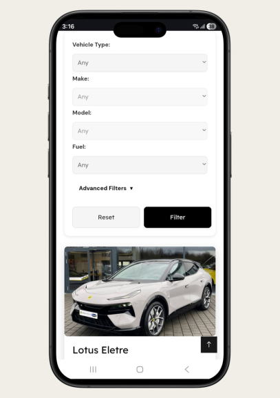 Users can filter vehicles by brand, price, mileage, fuel type and more.