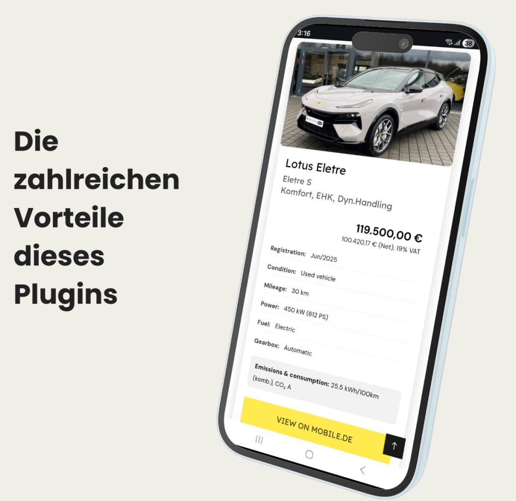 Unser Plugin löst diese Probleme, indem es sich auf Leistung, Flexibilität und nahtlose Integration mit mobile.de konzentriert.